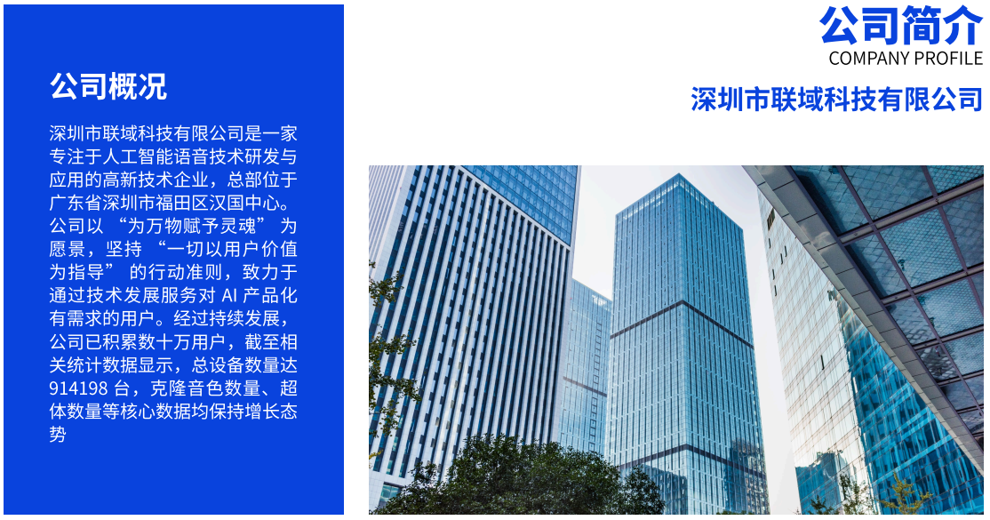 深圳市联域科技有限公司是⼀家专注于⼈⼯智能语⾳技术研发与应⽤的⾼新技术企业,总部位于⼴东省深圳市福⽥区汉国中⼼。公司以“为万物赋予灵魂”为愿景,坚持“⼀切以⽤⼾价值为指导”的⾏动准则,致⼒于通过技术发展服务对AI 产品化有需求的⽤⼾。经过持续发展,公司已积累数⼗万⽤⼾,截⾄相关统计数据显⽰,总设备数量达914198台,克隆⾳⾊数量、超体数量