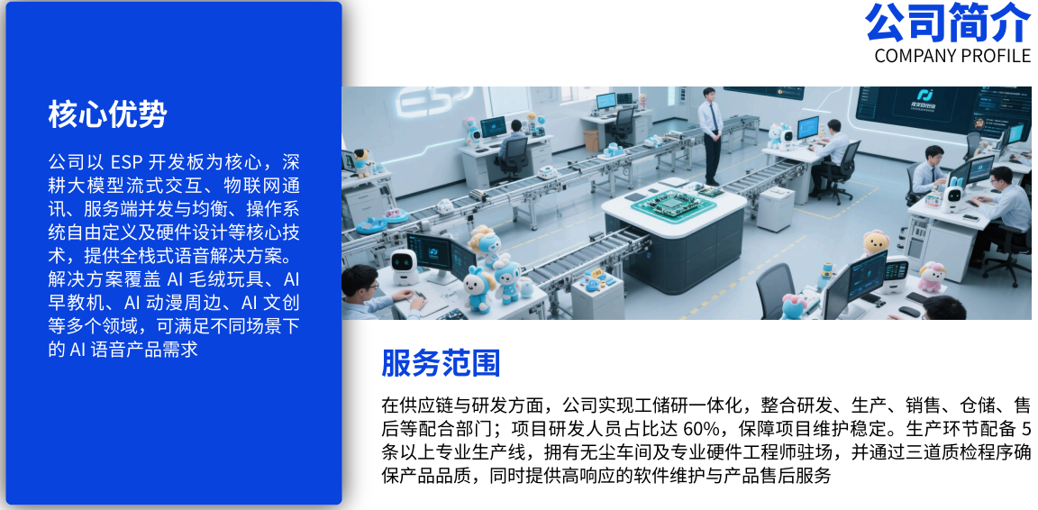 公司以 ESP 开发板为核⼼,深耕⼤模型流式交互、物联⽹通讯、服务端并发与均衡、操作系统⾃由定义及硬件设计等核⼼技术,提供全栈式语⾳解决⽅案。解决⽅案覆盖 AI ⽑绒玩具、AI早教机、AI 动漫周边、AI ⽂创等多个领域,可满⾜