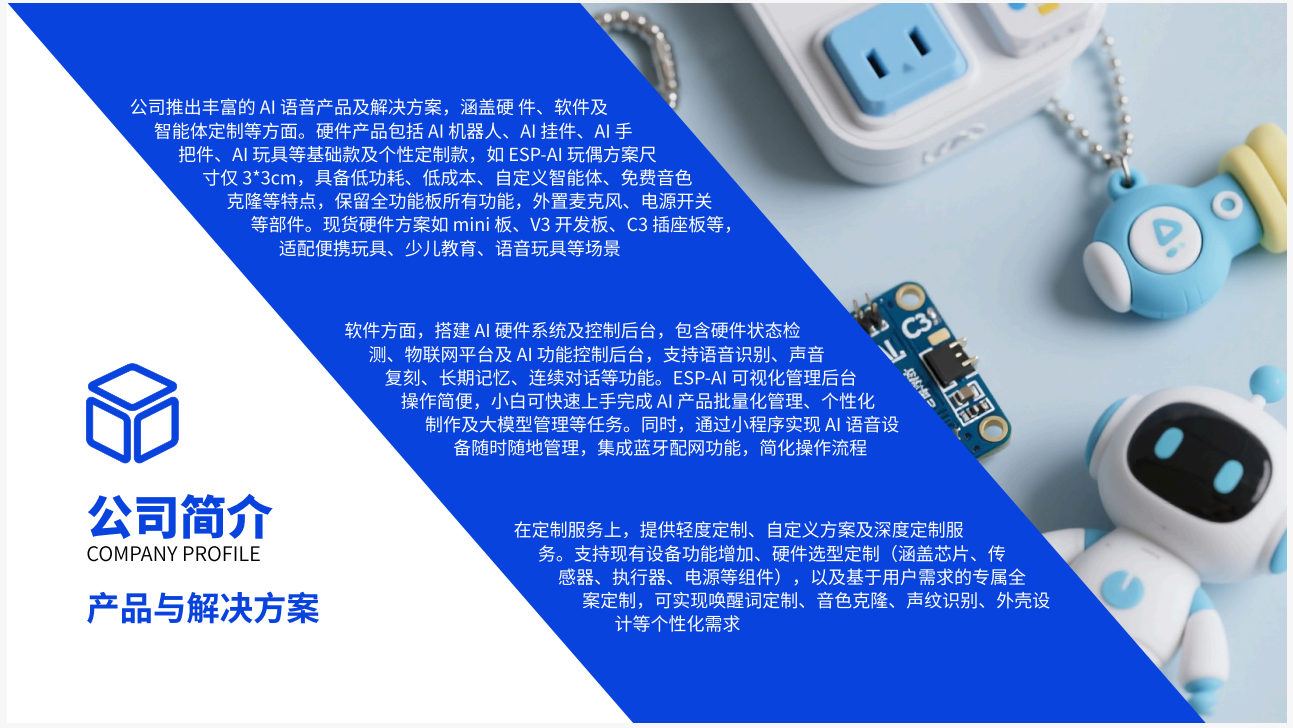 公司推出丰富的 AI 语⾳产品及解决⽅案,涵盖硬 件、软件及 智能体定制等⽅⾯。硬件产品包 A 机器⼈、A 挂件、A ⼿ 把件、I 玩具等基础款及个性定制款如 ESP-I 玩偶⽅ ⼨仅 3*3cm,具备低功耗、低成本、⾃定义智能体、免⾳⾊ 克隆等特点,保留全功能板所有功能,外置⻨克⻛、电源开关 等部件。现货件⽅案如 mini 板、V3 开板、C3 插座板等, 适配便携玩具、少⼉教育、语具等场景软⽅⾯搭建 AI 硬件系统及控制后台,包含硬件状态检 测物联平台及 AI 功能控制后台,⽀持别、声⾳ 复刻、⻓期记忆、连续对话等功。ESP-AI 可视化管理后台 操作简便,⽩可速上⼿完成 AI 产品批量化管理、个性化 制作及⼤模型管理等任务。时,过⼩程序实现 AI 语⾳设 备随时随地管理,集成蓝⽛功能,简化操作流程在定制服务上,提供轻度定制、定义⽅案及深度定制服 务。⽀持现有设备功能增加、硬件选型定制(涵盖芯⽚、传 感器、执⾏器、电源等组件)以及基于⽤⼾需求的专属全 案定制,可实现唤醒