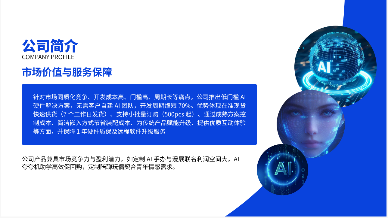 针对市场同质化竞争、开发成本⾼、⻔槛⾼、周期⻓等痛点,公司推出低⻔槛 AI硬件解决⽅案,⽆需客⼾⾃建 AI 团队,开发周期缩短 70%。优势体现在准现货快速供货(7 个⼯作⽇发货)、⽀持⼩批量订购(500pcs 起)、通过成熟⽅案控制成本、简洁嵌⼊⽅式节省装配成本、为传统产品赋能升级、提供优质互动体验等⽅⾯,并保障 1 年硬件质保及远程软件升级服务公司产品兼具市场竞争⼒与盈利潜⼒,如定制 AI ⼿办与漫展联名利润空间⼤,AI夸夸机助学⾼效促回购,定制陪聊玩偶契合⻘年情感需求。