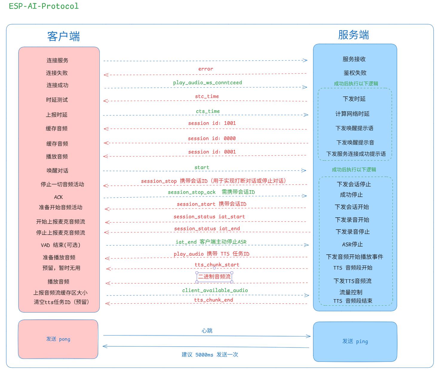 ESP-AI 通信协议是一套专为 边缘 AI 设备 与 云端服务 设计的高性能通信标准。基于统一的协议规范,无论客户端 / 服务端采用何种编程语言实现,均可实现与任何兼容 ESP-AI 标准的 智能硬件 或 云服务 的无缝通信。